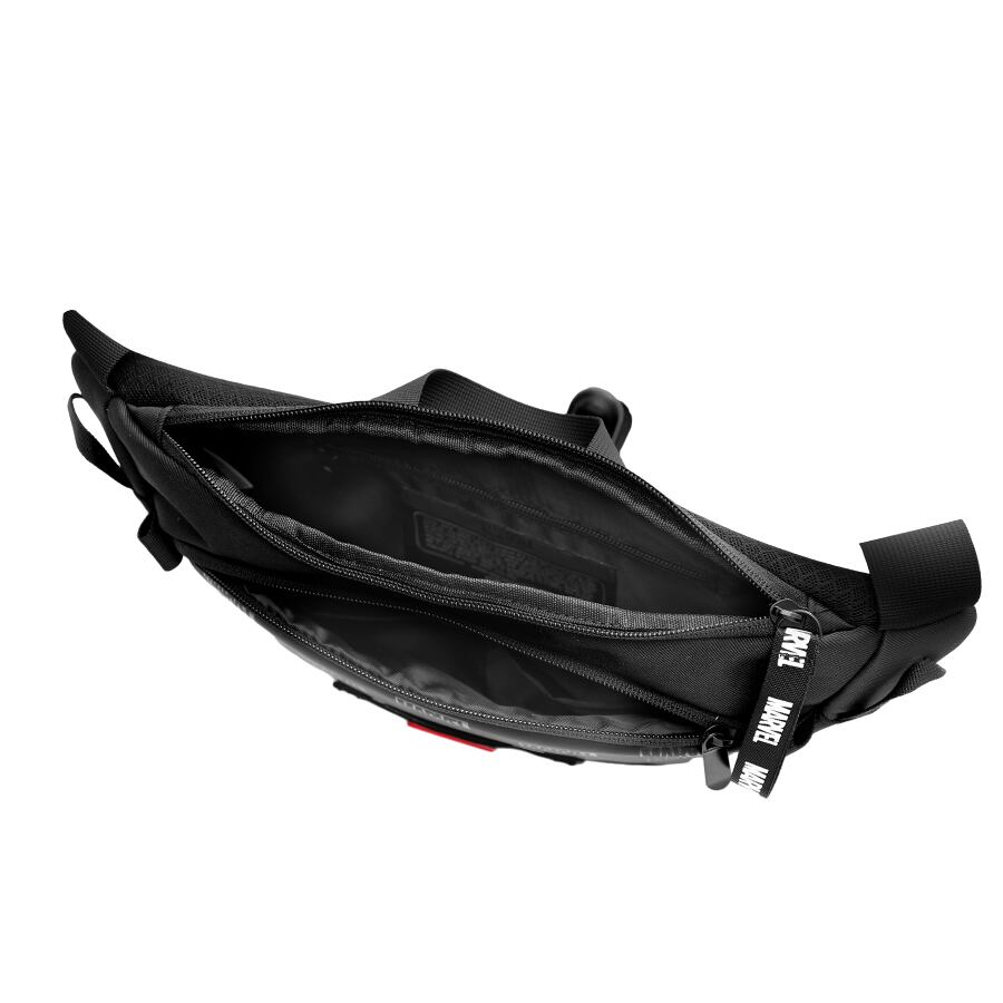ブラックを基調としたシンプルなデザインに、フロント中央の 赤いMARVELロゴ が印象的なショルダーバッグ。さらに本体全体には、 黒字のMARVELロゴ が散りばめられており、光の加減で浮かび上がるようなデザインです。